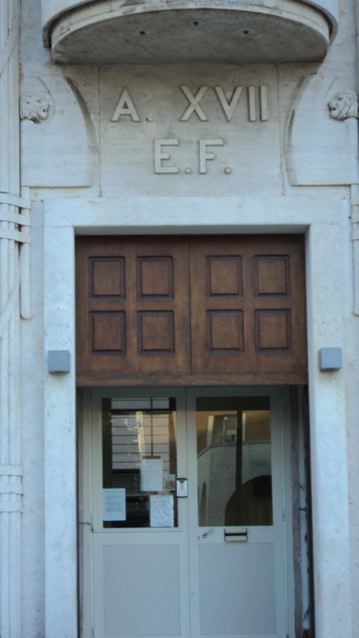 I live in one of the newest cities in Italy, It is the last of the "new cities" founde by Mussolini, in the 30' s, as can be seen on the upperside of the door of one of the building: 17th year of the Fascist Era, (yes, he thought himself God and so started a new Era. Actually, is History, so its stay there as a part of the past of the city.